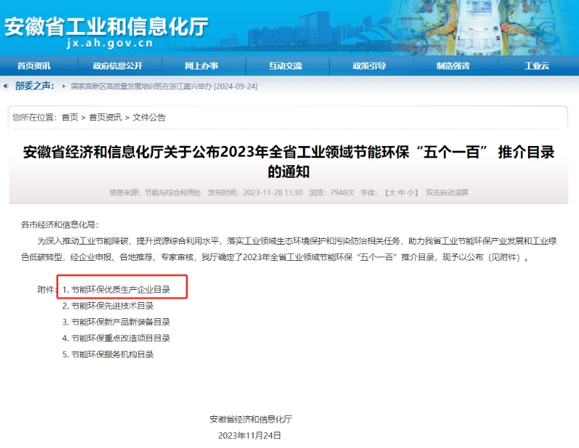 安徽省經(jīng)濟(jì)和信息化廳發(fā)布了《關(guān)于公布2023年全省工業(yè)領(lǐng)域節(jié)能環(huán)保“五個(gè)一百” 推介目錄的通知》,經(jīng)企業(yè)申報(bào)、各地推薦、專家審核,公示環(huán)節(jié)后,我司上榜節(jié)能環(huán)保優(yōu)質(zhì)生產(chǎn)企業(yè)目錄。